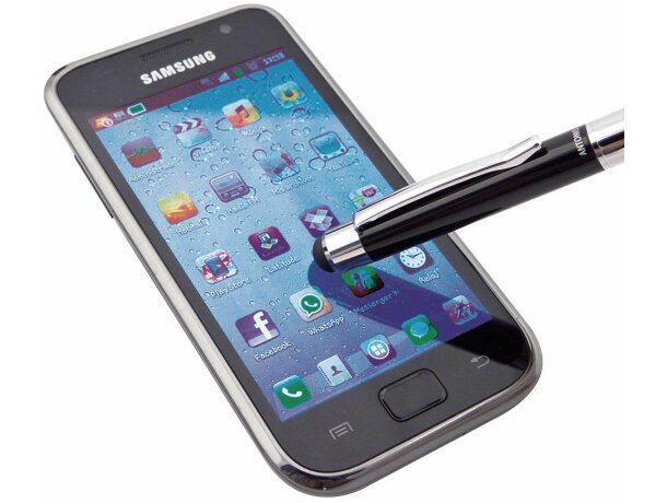 Leer MásSofisticado bolígrafo Yago con puntero táctil integrado y acabado bicolor plateado-negro que combina funcionalidad con elegancia para boligrafos personalizados para empresas que desean destacar su logo y regalarlo en eventos premium.