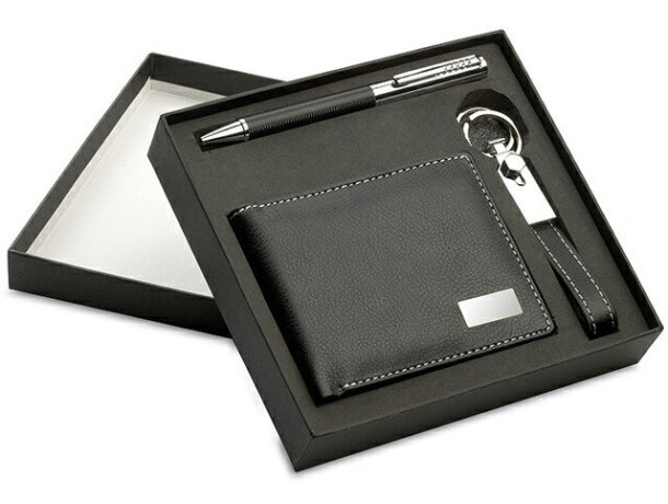 Este conjunto corporativo de tres piezas combina elegancia y funcionalidad en una presentación impecable. El set incluye bolígrafo de mecanismo giratorio, llavero metálico y cartera ejecutiva, todos con acabados en negro y costuras contrastantes que transmiten distinción profesional.