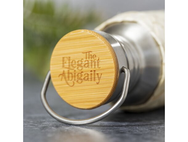 El tapón de seguridad a rosca con base de bambú garantiza un sellado perfecto, mientras que el asa de transporte integrada facilita su uso diario tanto en oficina como en actividades al aire libre. Su diseño exclusivo, protegido por derechos de propiedad industrial, lo posiciona como un regalo corporativo distintivo.