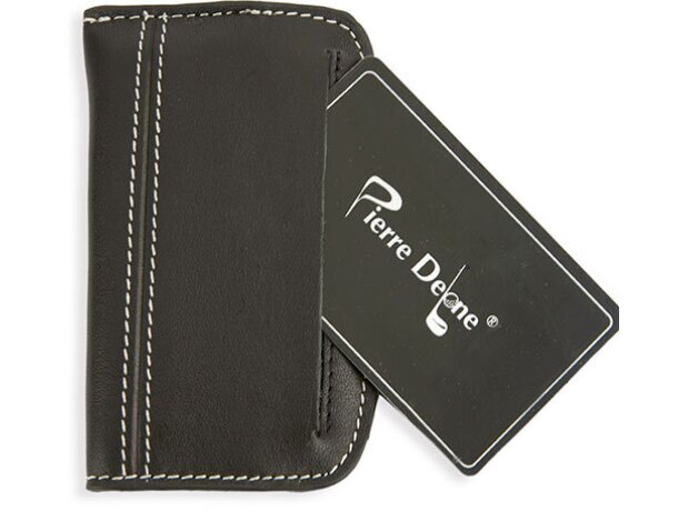 La zona de marcaje disponible mide 30 x 15 mm, ubicada estratégicamente en la superficie frontal del tarjetero para máxima visibilidad. Esta dimensión permite incorporar logotipos, textos o diseños corporativos manteniendo la elegancia del conjunto.
