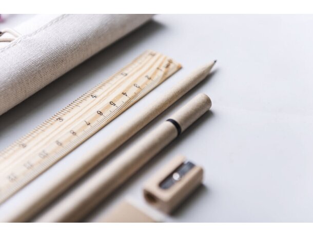Leer MásEstuche personalizable con logo Sulpox de yute y algodón que reúne 5 accesorios de escritura sostenibles: regla de madera, lápiz natural, goma, sacapuntas y bolígrafo de cartón.