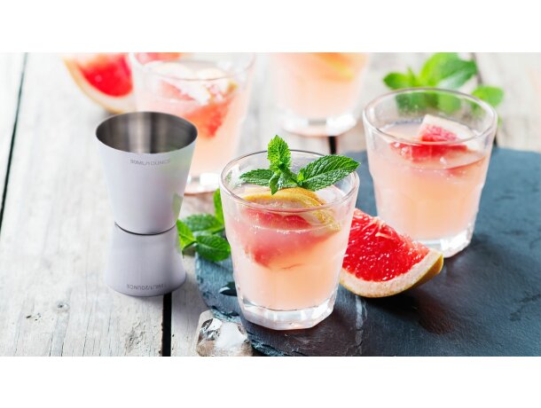 Medidor Roley acero mate coctelería con grabado publicidad láser
