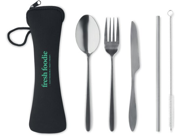 Los cubiertos ofrecen dos zonas de impresión laterales en la funda de neopreno, cada una con un área máxima de 100x20mm. Estas dimensiones proporcionan espacio suficiente para logotipos empresariales, nombres o diseños creativos que destaquen tu marca o personalidad.