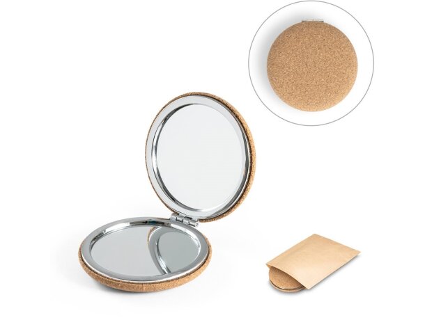 El acabado en corcho natural aporta una textura orgánica única, mientras que el cristal espejado de alta calidad asegura una reflexión perfecta para retoques de maquillaje en cualquier momento del día.
