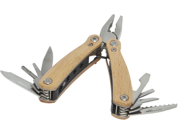 Leer MásMultiherramienta compacta y duradera con logo para empresa, fabricada en acero inoxidable y mango de madera de haya sostenible, ideal para exploradores y entusiastas al aire libre.