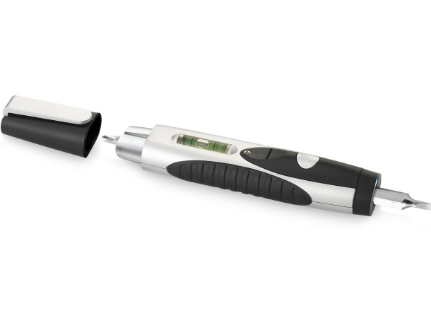 Esta multiherramienta compacta de 6 funciones combina practicidad y eficiencia en un diseño ergonómico de apenas 42 gramos. Su acabado en negro intenso con detalles plateados no solo aporta elegancia, sino que resiste el uso diario en cualquier entorno de trabajo. La luz LED integrada con interruptor independiente la convierte en la compañera ideal para tareas en espacios con poca iluminación, mientras que sus destornilladores de estrella y planos en diferentes tamaños garantizan versatilidad para múltiples reparaciones.