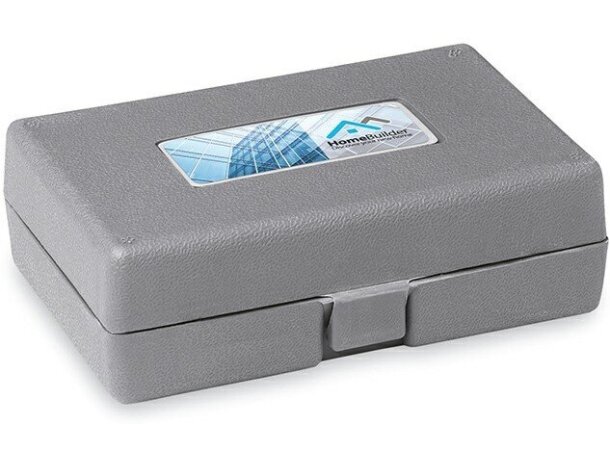El área máxima de marcaje es de 70 x 30 mm en la parte superior de la caja, proporcionando espacio suficiente para logotipos corporativos, nombres de empresa o mensajes promocionales. Esta zona permite personalizar el set manteniendo la funcionalidad y estética del producto.