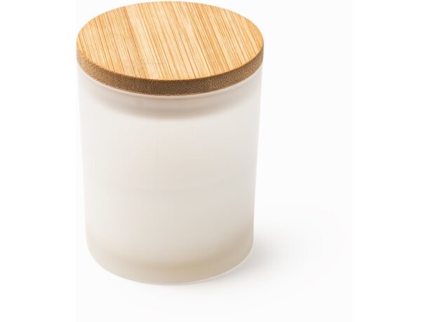 Dispones de tres zonas estratégicas para personalizar tu vela aromática: el cuerpo de cristal con área máxima de 1,5 x 4 cm y la tapa de bambú con área de 4,5 x 4,5 cm. Estas dimensiones permiten incorporar logotipos, textos o diseños que mantengan la elegancia del producto.