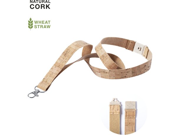 Este lanyard original combina funcionalidad y sostenibilidad en un diseño de apenas 13 gramos. Fabricado con corcho natural y caña de trigo, ofrece un acabado único con la textura característica del corcho que aporta distinción a cualquier evento corporativo. Su cierre de seguridad en el cuello y mosquetón metálico giratorio garantizan comodidad y practicidad durante todo el día de uso.