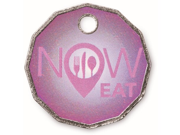 La personalización se aplica sobre la superficie superior del llavero, aprovechando al máximo el área de imitación de esmalte duro disponible. Esta zona permite impresión full color con excelente definición de detalles y colores vibrantes que resisten el desgaste diario.