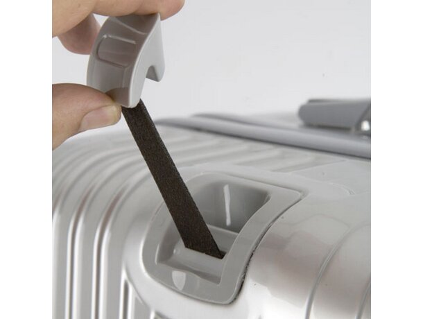Las zonas de marcaje principales se localizan en la superficie frontal y lateral del trolley, aprovechando el acabado liso del ABS metalizado. El área máxima recomendada es de 15 x 8 cm para garantizar una visualización óptima del diseño sin interferir con el funcionamiento de cremalleras y asas.