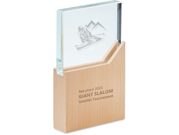 Este trofeo ofrece múltiples zonas de personalización que permiten maximizar el impacto visual de tu reconocimiento. En el cristal dispones de un área de 60x90 mm, perfecta para logotipos corporativos o mensajes conmemorativos, mientras que la base de madera natural permite grabados hasta 90x110 mm, ideal para textos más extensos o dedicatorias especiales.