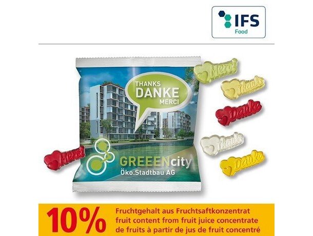 Leer MásGominolas personalizadas con etiqueta full color que expresa gratitud. Dulce comestible de sabores frutales variados para agradecer a clientes en acciones promocionales y ferias.