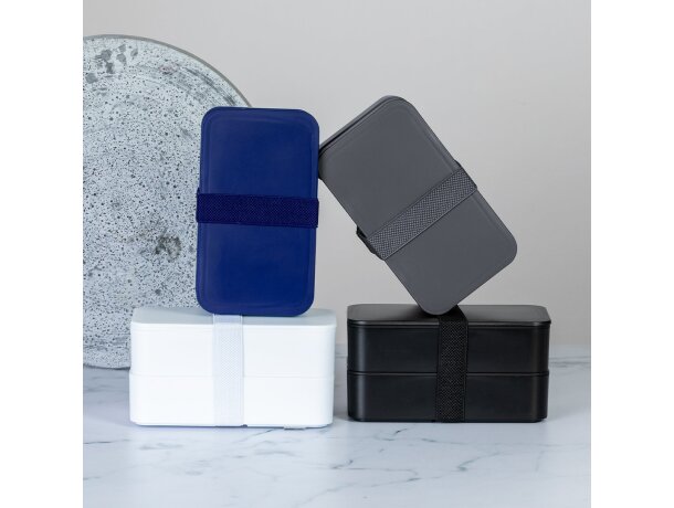 Leer MásFiambrera Vilma de polipropileno con dos compartimentos independientes de 700ml y cubiertos incluidos. Fiambreras personalizadas con cinta elástica de seguridad y certificación Food Grade.