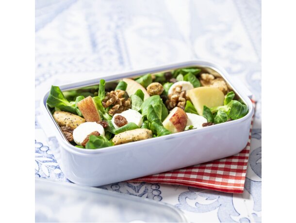 Las fiambreras ofrecen dos zonas estratégicas para personalizarlas: la tapa superior con 6 x 8 cm de área máxima, perfecta para logos corporativos destacados, y la cara lateral con 8 x 2 cm, ideal para textos o elementos gráficos complementarios.