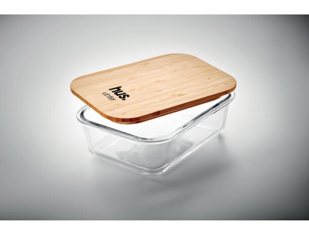 Leer MásFiambrera Tundra 900ml en vidrio borosilicato resistente al calor con tapa de bambú natural. Banda de silicona hermética. Fiambreras personalizadas aptas para microondas, apilables y fácil limpieza.
