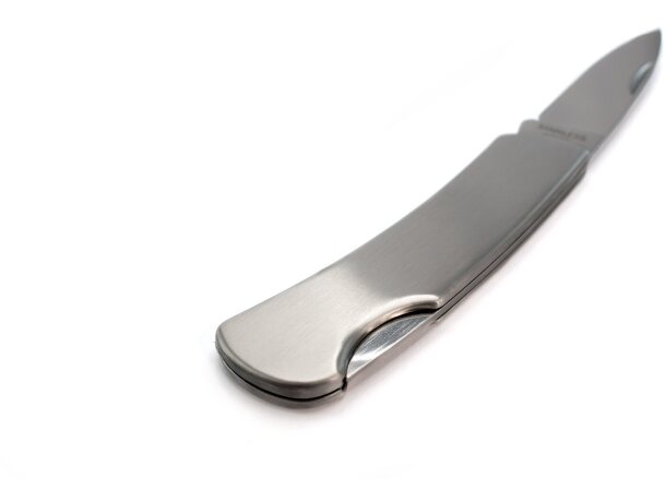 El área de personalización se ubica en el mango de la navaja, con unas dimensiones máximas de 4.5 x 1.2 cm. Esta zona permite incorporar logotipos, texto corporativo o diseños específicos mediante grabado láser de alta precisión. La superficie de acero inoxidable del mango ofrece un contraste excelente para personalizarlo con resultados duraderos y profesionales.