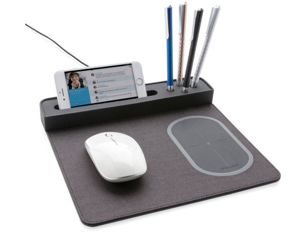 Leer MásAlfombrilla con carga inalámbrica 5W para merchandising corporativo que organiza tu escritorio con compartimentos para bolígrafos y soporte para teléfono, perfecta para espacios tecnológicos.