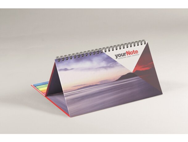 - Calendario de tapa dura (tamaño 211x194 mm, cerrado) con 12 hojas de calendario de 204x99 mm, 50 notas adhesivas (80 g) de 100x72 mm, 50 de 50x72 mm y 20 marcadores de 5 colores.