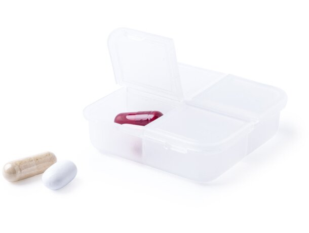 Leer MásPastillero Edmor de ABS translúcido con cuatro compartimentos independientes y tapas individuales. Organiza medicamentos y suplementos diarios de manera segura llevando tu logo visible.