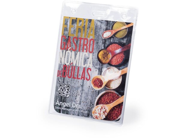 La zona de impresión del porta acreditaciones permite tampografía en área frontal de 5.5 x 6.5 cm máximo, ofreciendo espacio suficiente para logotipos, nombres de empresa o información del evento. Esta área está estratégicamente ubicada para máxima visibilidad sin interferir con la funcionalidad del identificador.