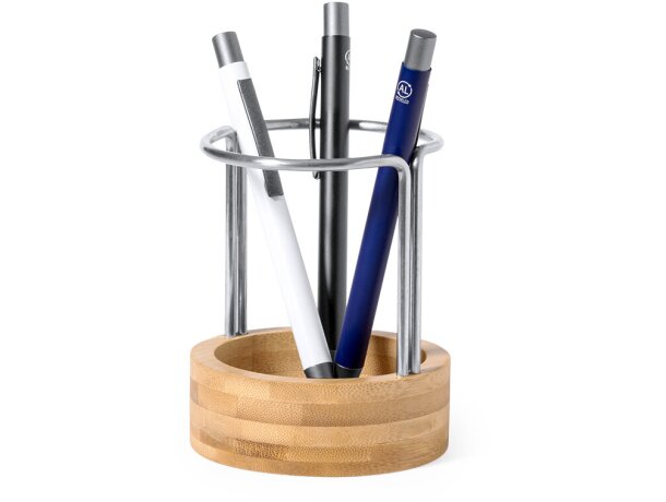 Portalápices Oswin con bambú barnizado y detalles en acero inox