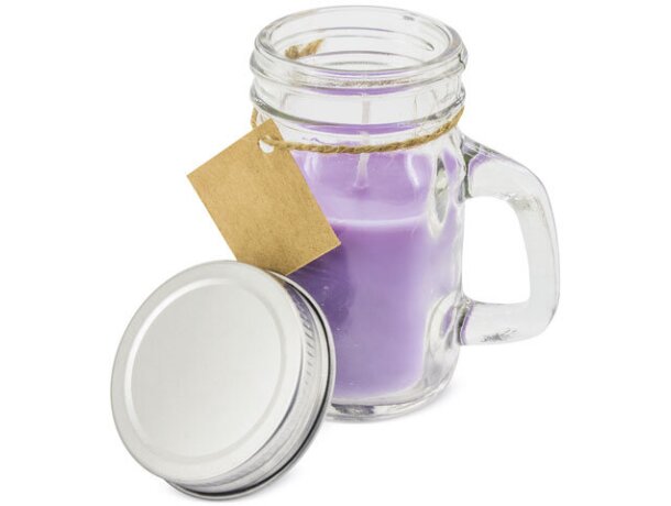 Vela para boda con logotipo Enca en jarrita de cristal con asa y tapa metálica