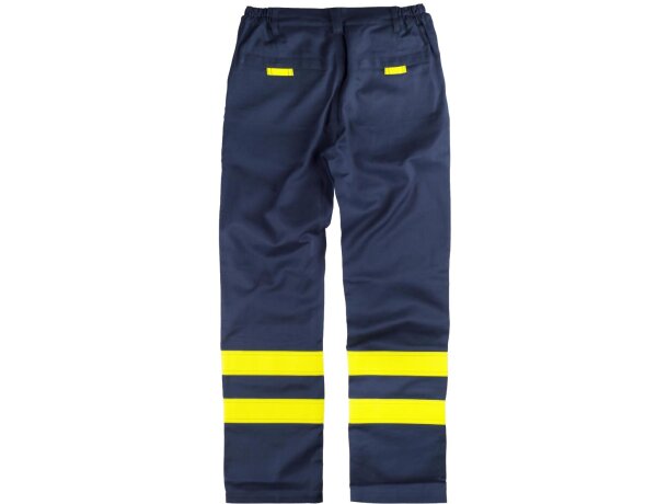 El diseño técnico incluye dos bolsillos laterales de abertura inclinada y dos traseros con carteras de seguridad y ojales. El cierre cuenta con botón metálico y cremallera de metal para mayor durabilidad en trabajos industriales exigentes.