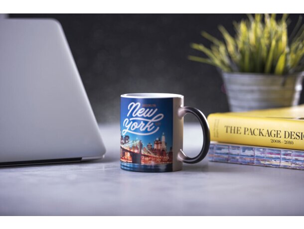 Aplicamos dos técnicas principales de marcaje adaptadas a las características específicas de esta taza. La sublimación es nuestra técnica estrella, permitiendo reproducir diseños complejos con múltiples colores y degradados. Esta técnica aprovecha el contraste del exterior negro para crear efectos visuales únicos, siendo perfecta para fotografías, logotipos multicolor y diseños creativos.