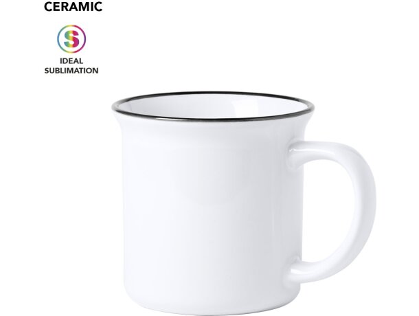 Leer MásTaza cerámica vintage Gover 300ml con acabado bicolor sofisticado. Cuerpo blanco y anilla contrastante. Personalizadas mediante sublimación completa, baratas con logotipo impreso nítidamente.