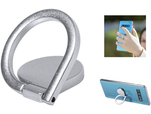 Leer MásSoporte para movil con logo Kafu en acabado metálico mate que se fija mediante adhesivo 3M removible. La anilla giratoria mejora el agarre del dispositivo y permite usarlo como atril en cualquier superficie.
