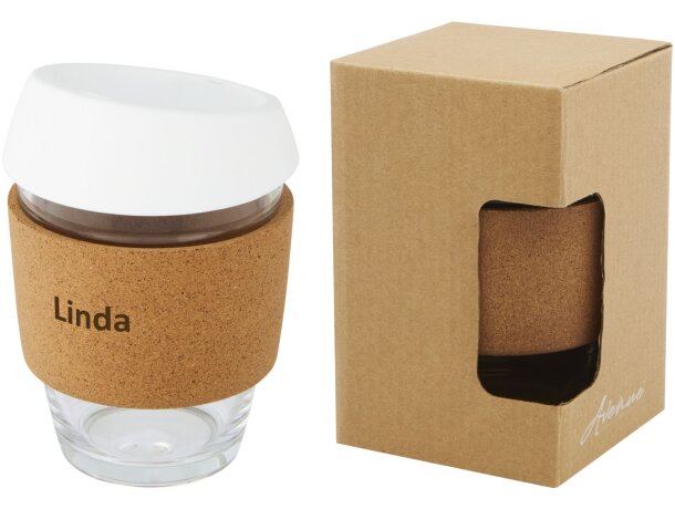 Leer MásVaso de vidrio borosilicato con corcho natural como agarre térmico y tapa silicona extraíble de 360 ml. Superficie lista para impresión que aporta distinción con compromiso ecológico.