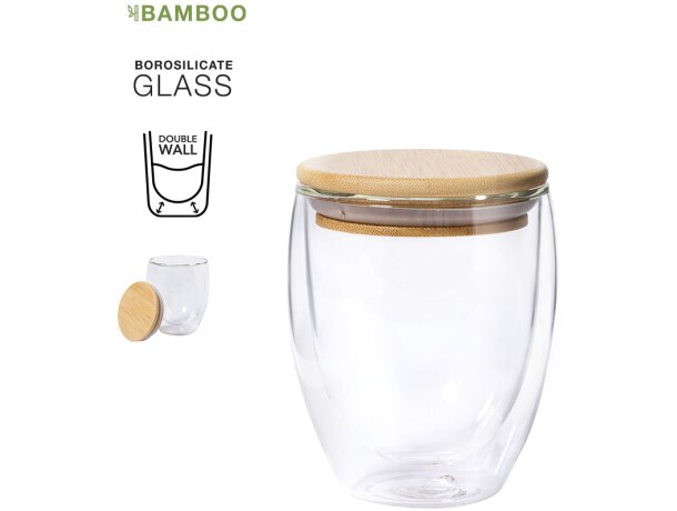 Este vaso térmico ofrece dos áreas estratégicas para personalizarlo según tus necesidades: zona centrada en la parte superior del cristal (2.5 x 3 cm) ideal para logotipos compactos, y área centrada en la tapa de bambú (5.5 x 5.5 cm) perfecta para diseños más amplios o textos descriptivos.