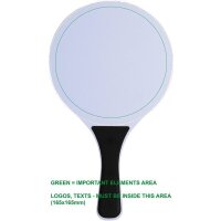 Las palas de playa Mini Match ofrecen múltiples posiciones de marcaje para maximizar la visibilidad de tu diseño. En las superficies principales de las raquetas puedes aplicar serigrafía hasta 4 colores en un área máxima de 130x130mm por cara, perfecto para logos corporativos o mensajes promocionales.
